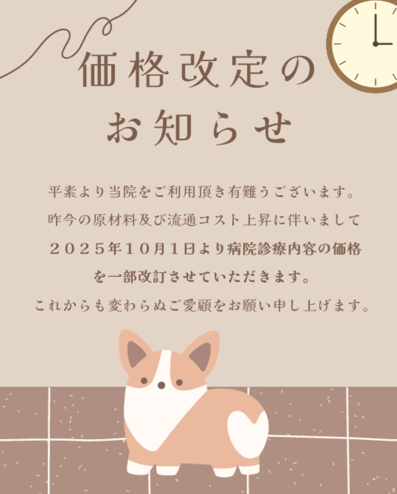 初めての方へ スタッフ紹介 採用情報 お問合せ 当院について ごあいさつ 施設案内 アクセス 診療のご案内 診療科目 料金案内 支払い方法 ペットホテル・美容室 ペットホテル トリミングサロン 各種サービス 往診サービス オンライン診療 パピークラス 老齢動物介護 外来診療WEB予約 03-3609-7517 獣医師出勤表 TOP MENU 外来診療:WEB予約 アクセス 【診療時間】 9:00〜19:00(18:30受付終了) 年中無休 【対象動物】 犬・猫・エキゾチックアニマル(ウサギ・鳥・ハムスター・フェレット・フクロモモンガなど) 初めての方へ 病院だより 当院について ごあいさつ 施設 アクセス 診療のご案内 料金案内 お支払い方法 診療科目 歯科 眼科 循環器科 消化器科 エキゾチックアニマル科 泌尿器科 腫瘍科 去勢/避妊 皮膚科 呼吸器科 整形外科 血液内科 内分泌・代謝性疾患 神経科 耳鼻咽喉科 総合診療科 行動学 ペットホテル・美容室 ペットホテル トリミングサロン その他サービス オンライン診療 しつけ教室 往診サービス ペットシッター 老齢動物介護 スタッフ紹介 獣医師勤務表 問診票 採用情報 登録情報 会社概要 プライバシーポリシー 特定商取引法に基づく表記 病院だより News 金町>病院だより>価格改定のお知らせ 価格改定のお知らせ